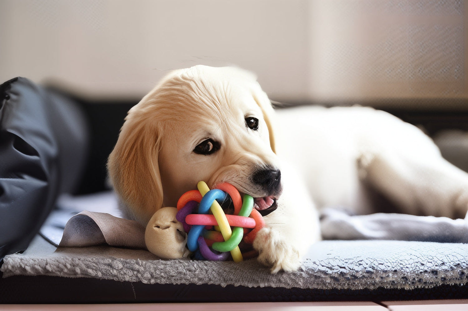 Happy Pup Playtime: Golden Retriever Enjoying a Colorful Chew Toy